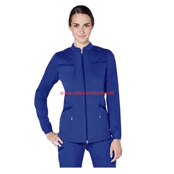 This exceptional royal blue scrub jacket is a standout piece! The vibrant royal blue fabric is perfectly complemented by the sleek, streamlined design. Featuring practical front pockets and a secure zip-up front, this jacket combines functionality with style. The refined cuffs and collar add a touch of sophistication, making it an ideal choice for healthcare professionals seeking both comfort and professionalism.